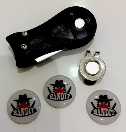 Golf Pitchfork Magnetic Hat Clip With 3 Masked Bandit 25mm Markers