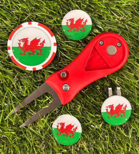 Golf Pitchfork Magnetic Hat Clip With 3 Welsh Flag Markers And Poker Chip